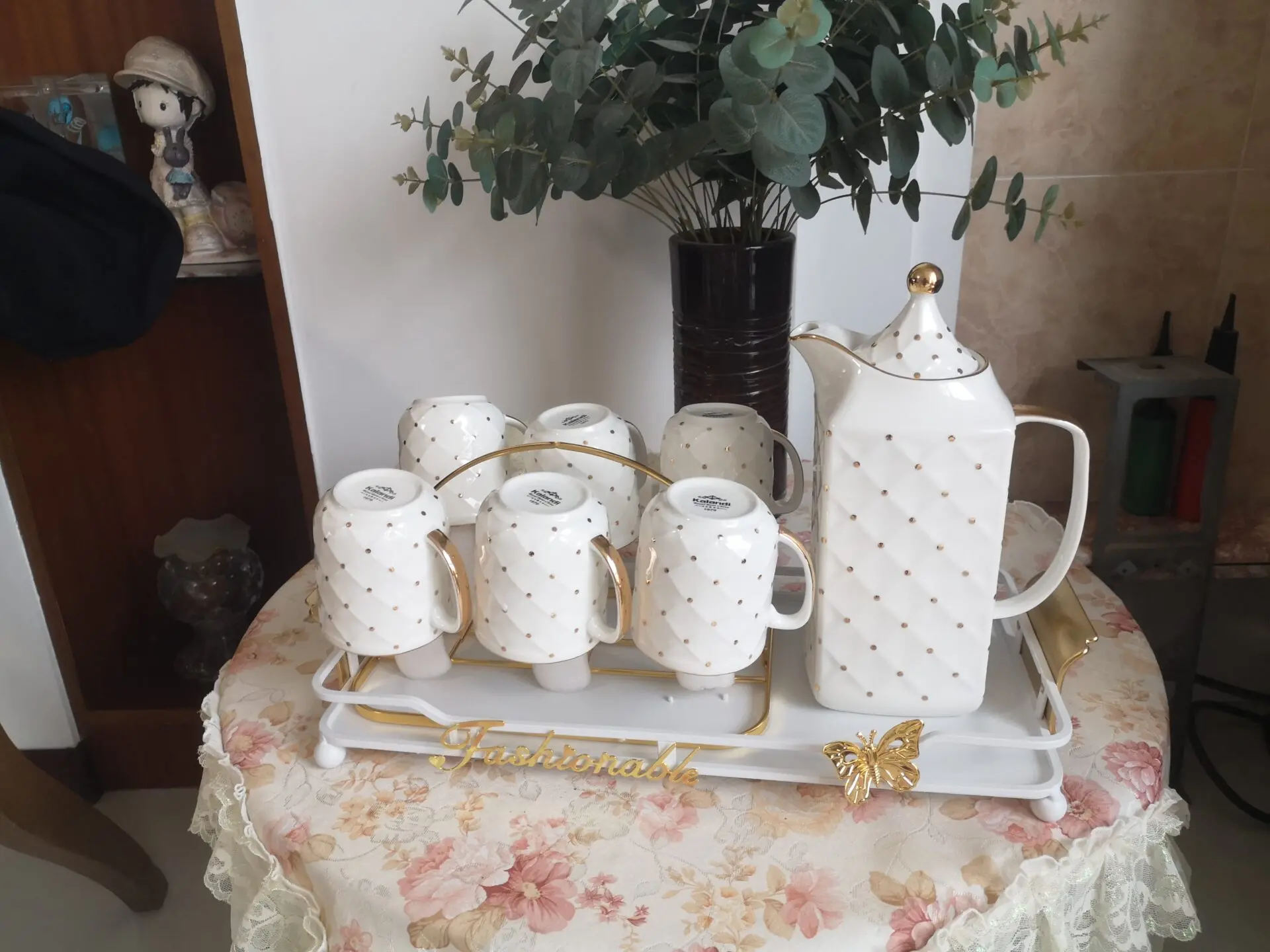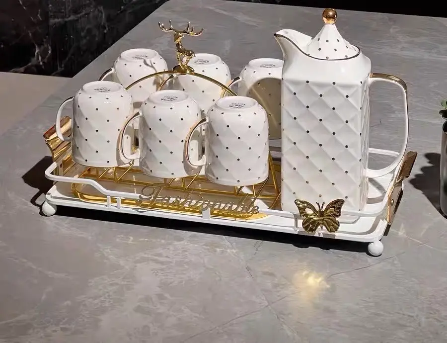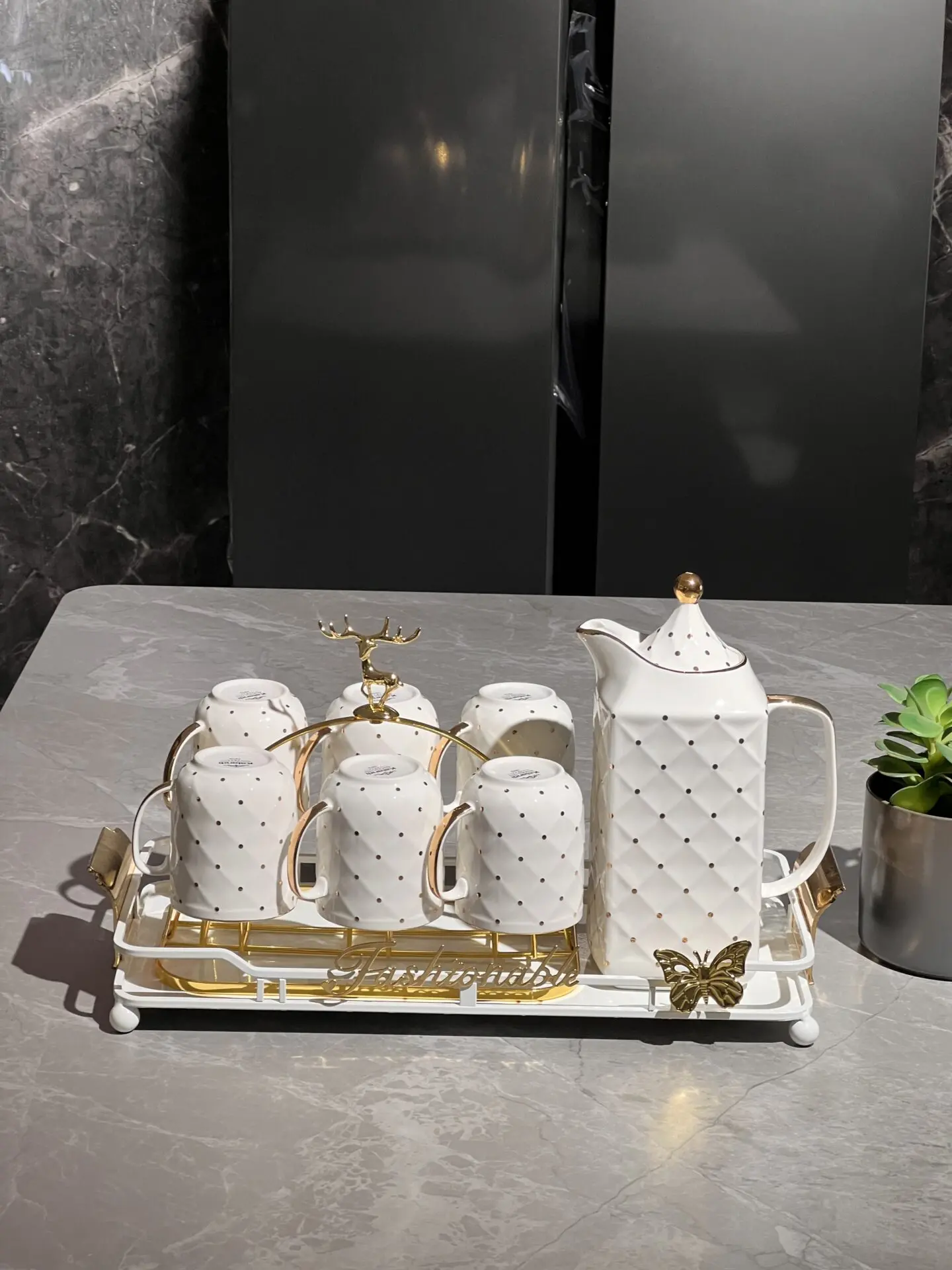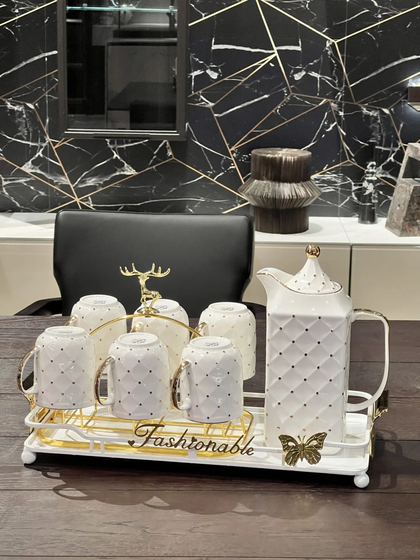 Indulge in tea time with this Fashionable Porcelain English Tea Set that features a modern teapot set design. The set is crafted from high-quality porcelain, with a white base and elegant gold polka dot accents, bringing a touch of luxury to your tea time. The creative deer holder adds an extra layer of sophistication, while the butterfly-decorated tea tray creates a lively atmosphere in your kitchen or dining area.