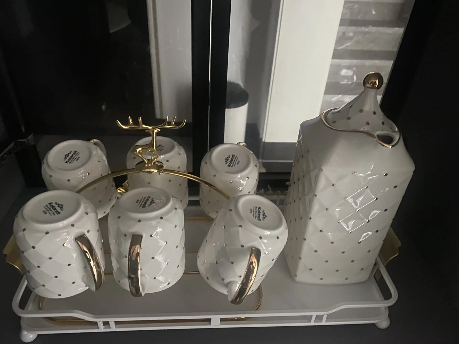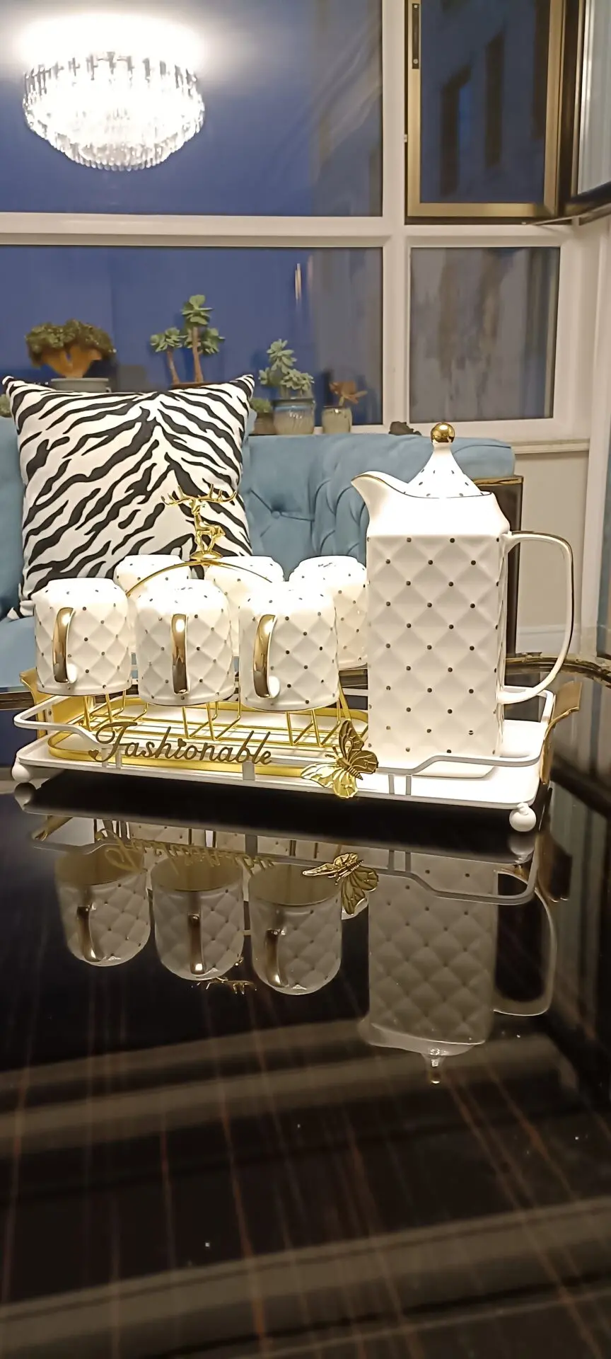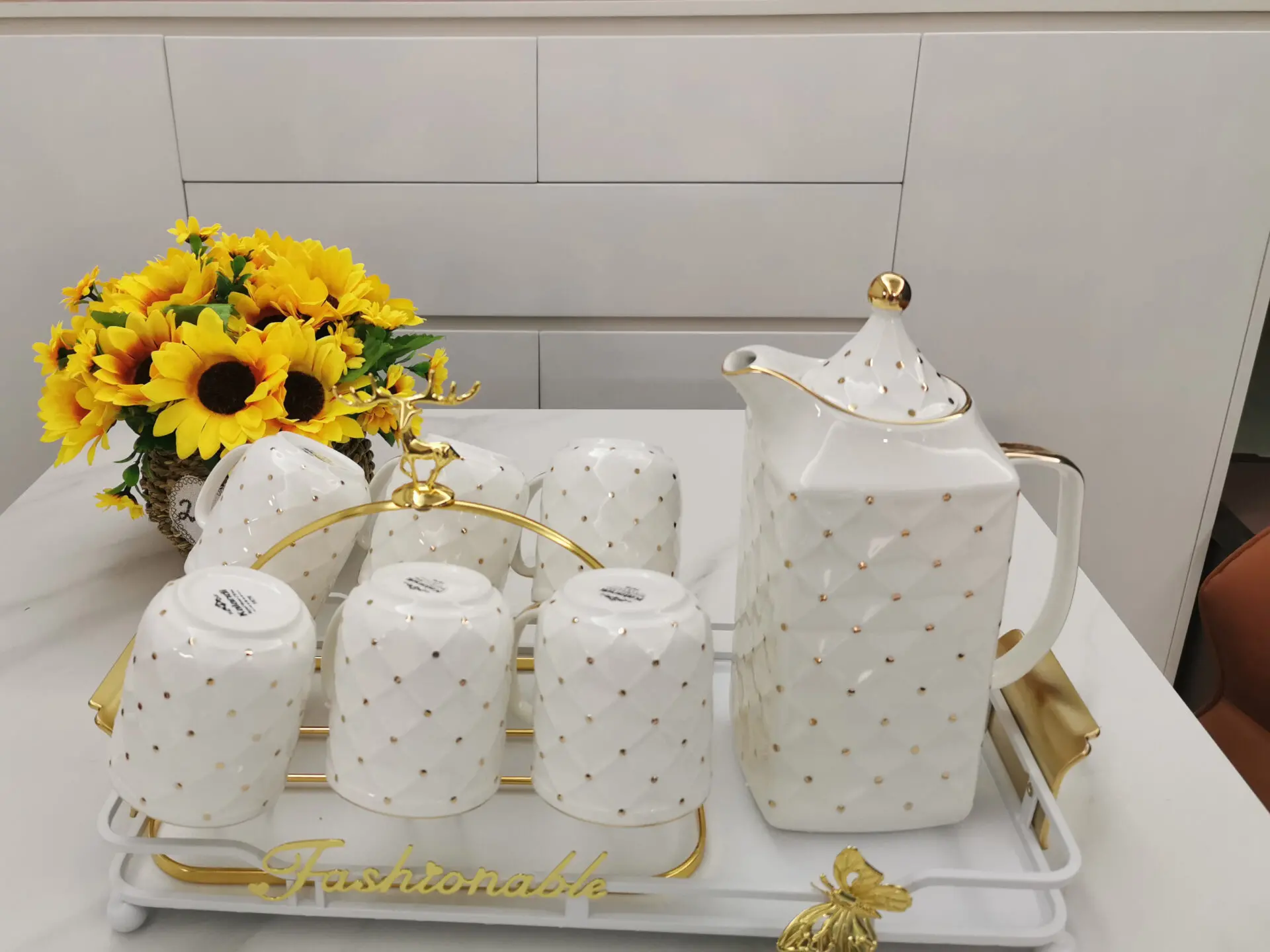 Indulge in tea time with this Fashionable Porcelain English Tea Set that features a modern teapot set design. The set is crafted from high-quality porcelain, with a white base and elegant gold polka dot accents, bringing a touch of luxury to your tea time. The creative deer holder adds an extra layer of sophistication, while the butterfly-decorated tea tray creates a lively atmosphere in your kitchen or dining area.