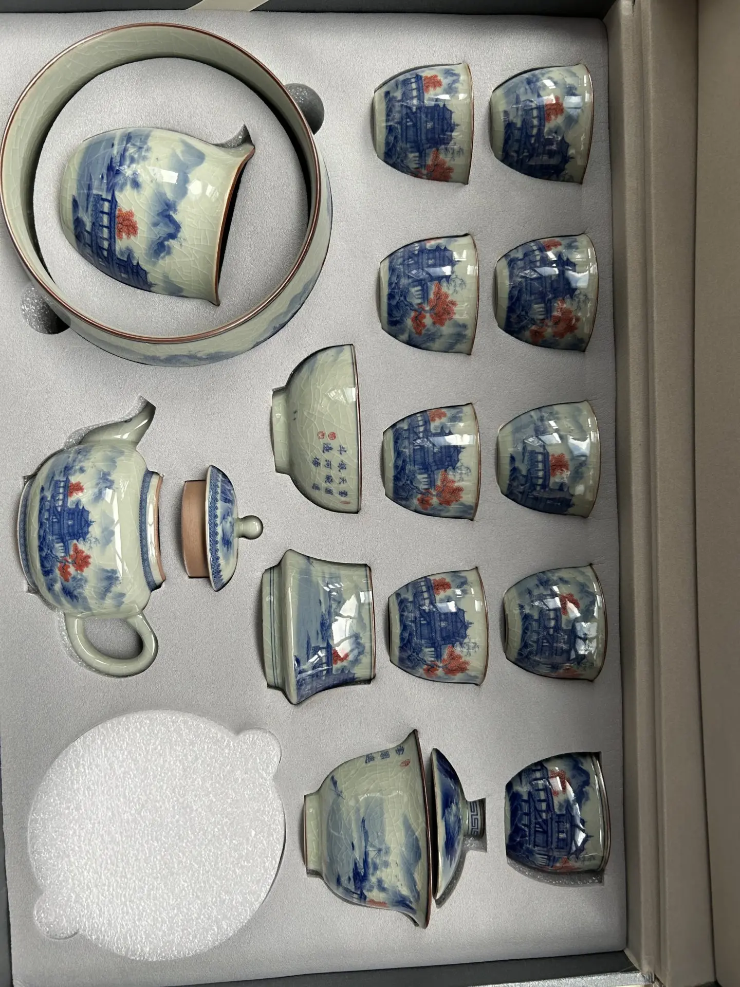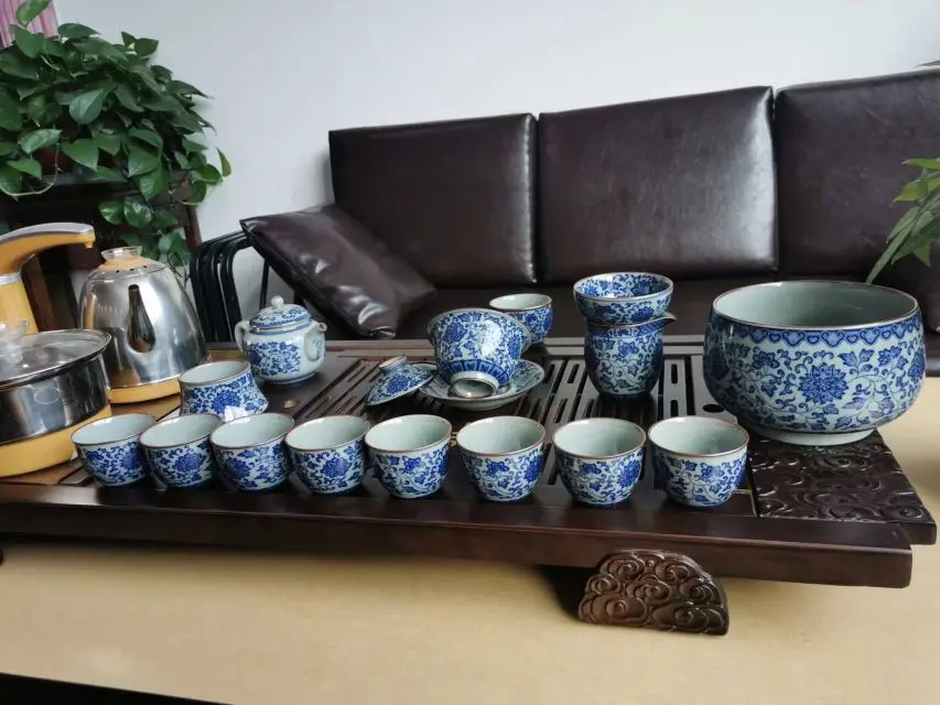 This pure handmade blue and white porcelain tea set is a masterpiece from Jingdezhen, China. The delicate porcelain is made with fine clay and is fired at high temperatures to give it a glossy finish. The blue and white patterns are hand-painted with great attention to detail, creating a classic and timeless look. Chinese blue and white porcelain is made with underglaze decoration, which makes it durable and fade-resistant.