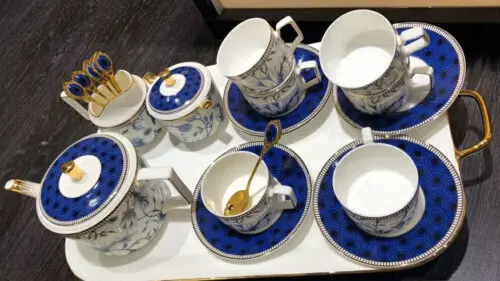 The set came wrapped in perfect condition. The quality is much better than I expected. They look very delicate, and elegant. The design is fantastic with lots of fine details, and the color looks elegant with blue and white. So I bought a second set for my tea party.