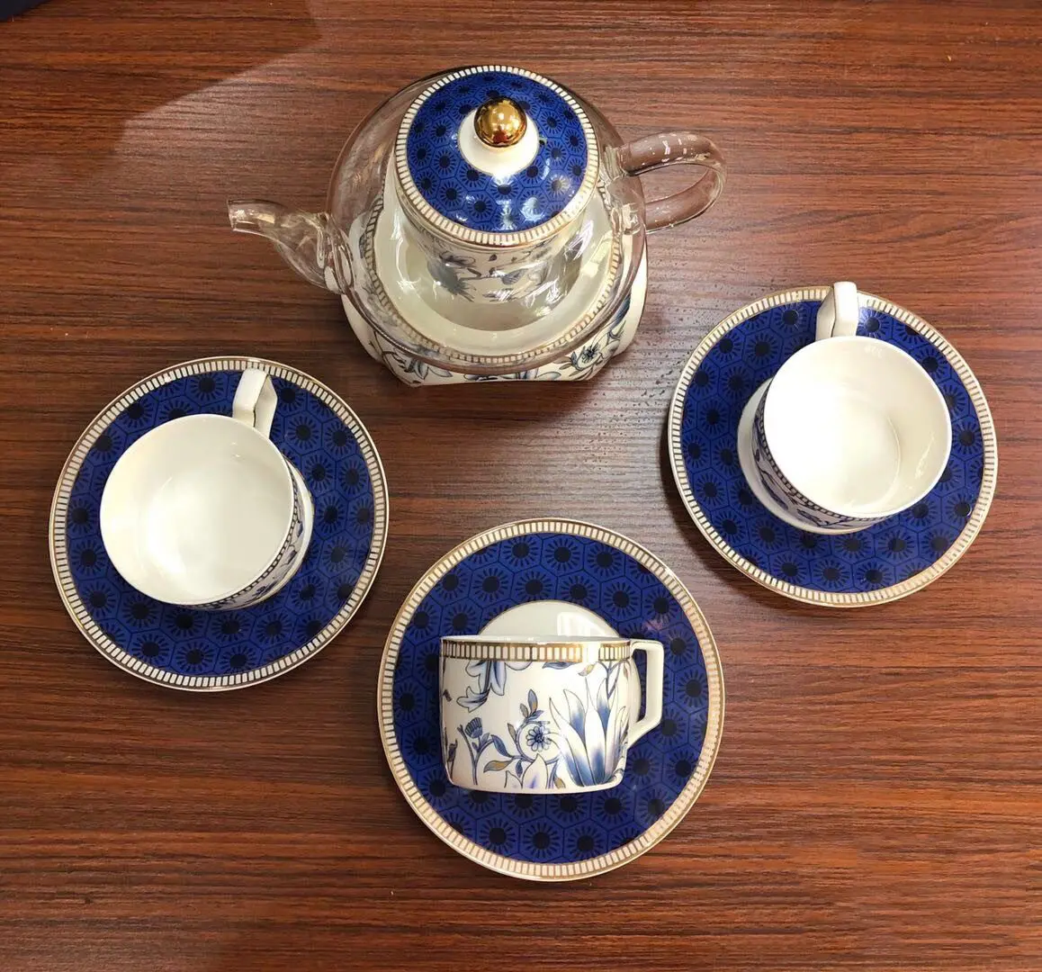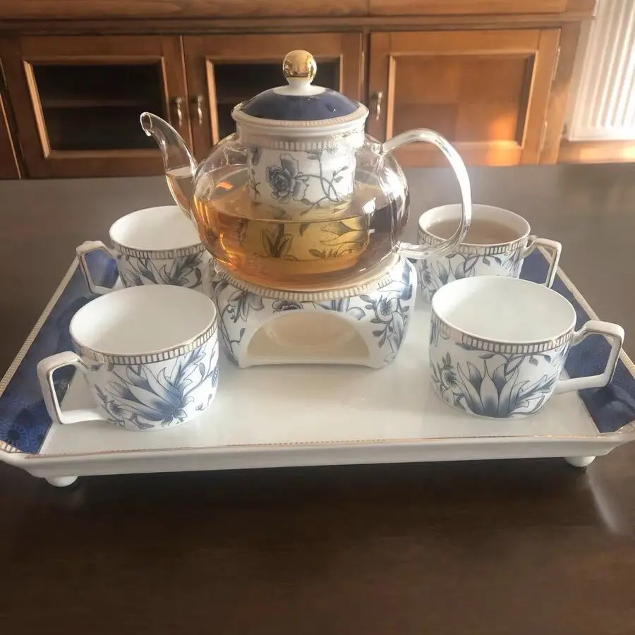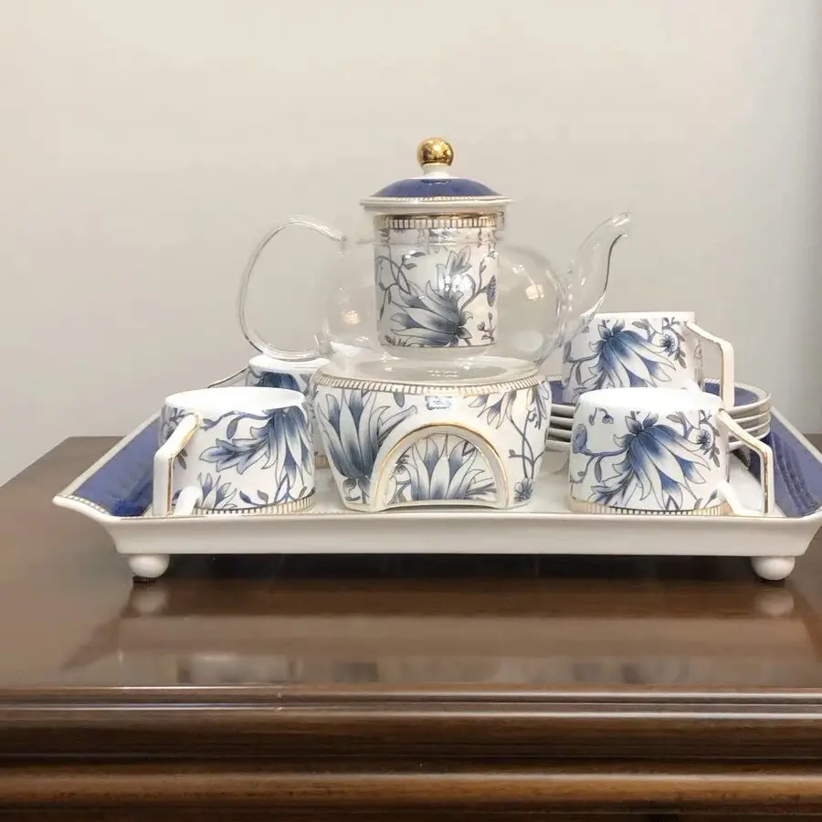 Elevate your tea-drinking moments with our exquisite Yucca English Bone China Tea Set. Immerse yourself in the classic charm of blue and white hues adorned with a beautiful Yucca flower pattern, creating an atmosphere of timeless elegance. This complete tea set includes a glass teapot with a convenient warmer and four cups, and you can choose the option with a luxurious tea tray. Made with high-quality bone china, this set ensures durability and longevity, making it a sophisticated choice for your afternoon tea gatherings. Order now and let the Yucca English Bone China Tea Set become the centerpiece of your refined tea-drinking experience.