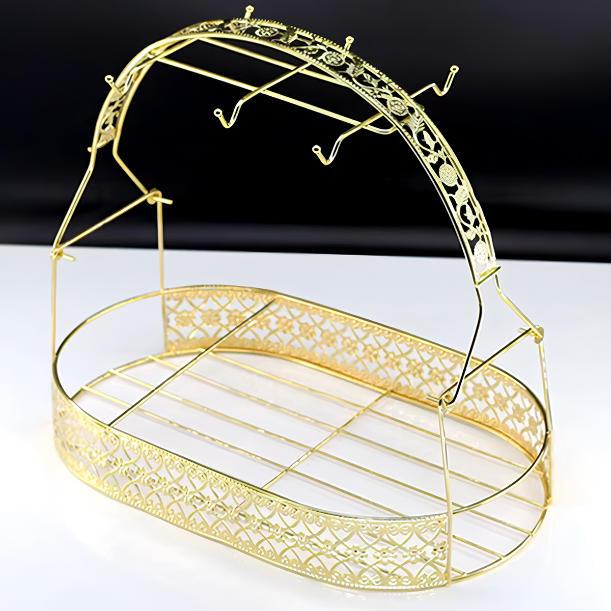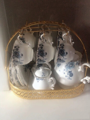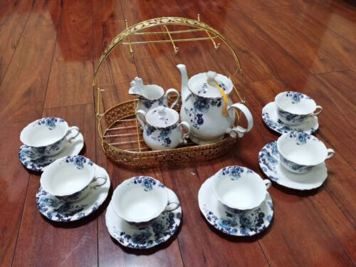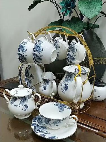 | Full tea set with creamer and sugar bowl | Comes with a convenient metal stand | Include 6 metal rose-shaped teaspoons |