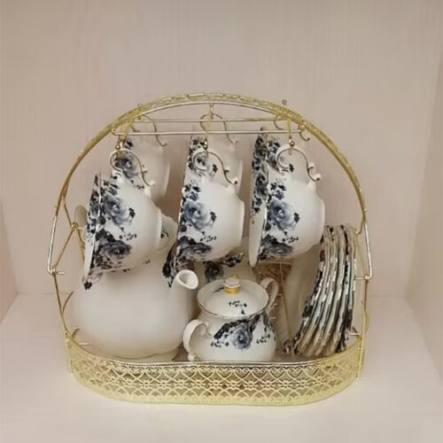 This versatile 16-piece tea set includes all the essentials for a delightful tea experience: a graceful teapot, matching cups, saucers, porcelain teaspoons, sugar bowl, creamer, and a convenient metal rack for easy storage and organization, maximizing space in your kitchen or dining area. To enhance your experience, we’ve also added 6 extra rose-shaped metal spoons for added durability and style. Durable and easy to maintain, this set is crafted for long-lasting beauty and effortless cleaning.