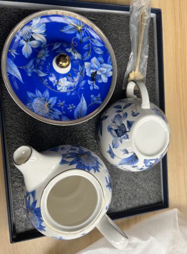 - Blue Peony Elegance: A captivating blue peony design, embellished with golden threads, adds a touch of regality to your tea experience.