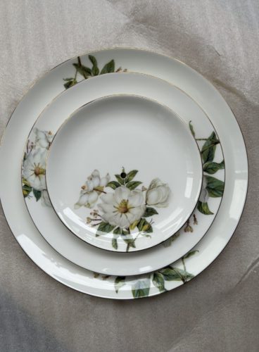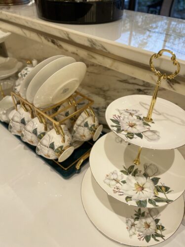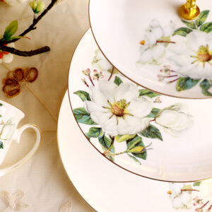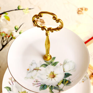Introducing our exquisite Camellia Cake Stand in Bone China, a sophisticated 3-tiered masterpiece that adds a touch of elegance to your table. The stand features intricately hand-painted camellia flower patterns, bringing a vibrant and charming allure that captivates the attention of your guests. Crafted from fine bone china, the surface boasts a smooth finish that not only enhances its aesthetic appeal but also facilitates easy cleaning. The luxurious gold-colored metal rods elegantly support each tier, elevating the overall opulence of this cake stand. Ideal for showcasing your delicious confections at any event, from lavish celebrations to intimate gatherings. Elevate your dessert presentation and make a statement with our Camellia Cake Stand—a perfect blend of artistic beauty and functional design.