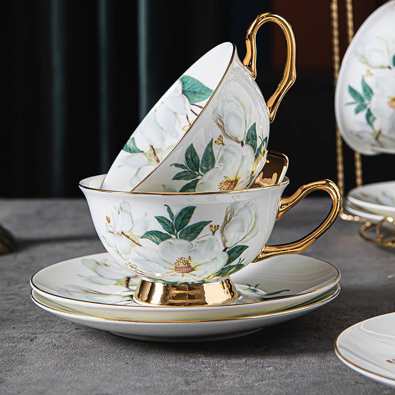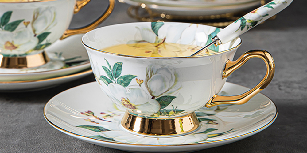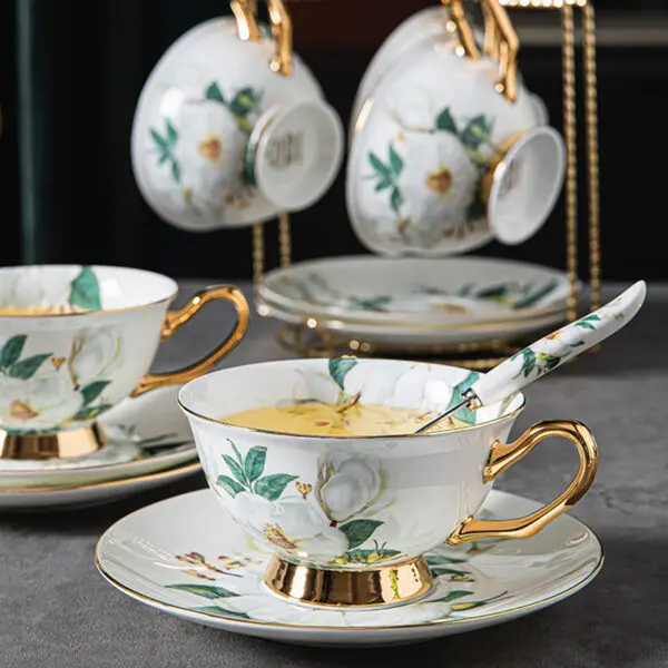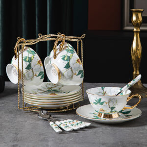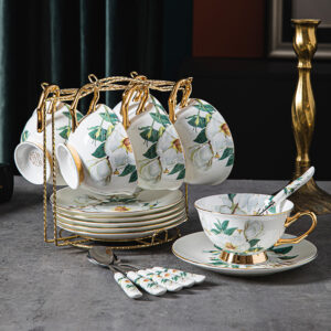Immerse yourself in the refined allure of our Camellia Tea Cup and Saucer Set, meticulously crafted in luxurious bone china. With a pristine white backdrop, this exquisite set showcases intricately designed camellia flowers that are both enchanting and lifelike. The bone china composition adds a touch of sophistication, while the gold-plated cup handles and bases exude opulence. Elevate your tea-drinking experience with this collection that effortlessly combines timeless style with the delicate beauty of camellias. Choose from four distinct options: serve for 1, serve for 2, serve for 4, or serve for 6, and make every tea moment a celebration of elegance.