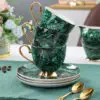 Immerse yourself in the captivating allure of our Green English Tea Set, a full porcelain ensemble that exudes sophistication and tranquility. This set, complete with a teapot, milk jug, sugar bowl, cups, and saucers, boasts a serene turquoise-green color reminiscent of a tranquil lake. The deep emerald-green texture adds a touch of refinement, creating a visual masterpiece that is both stable and elegant. Crafted with precision from high-quality ceramic, this set radiates luminosity, offering a clear, atmospheric aesthetic that enhances your tea-drinking experience.