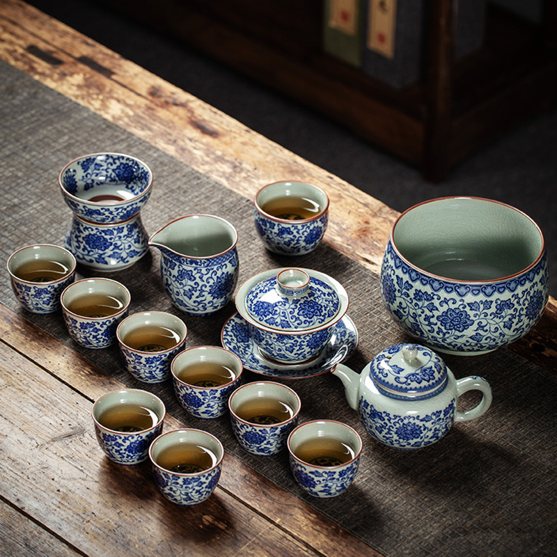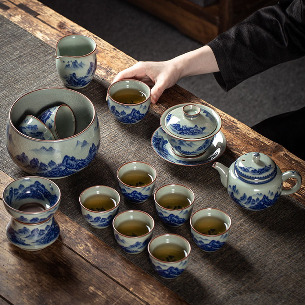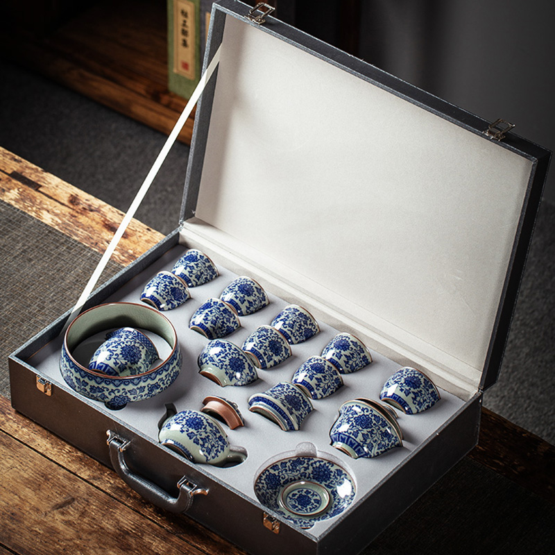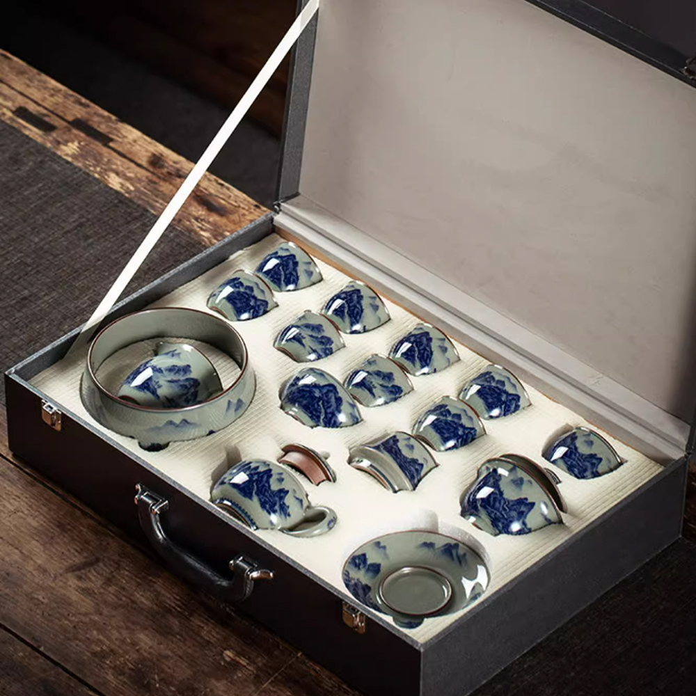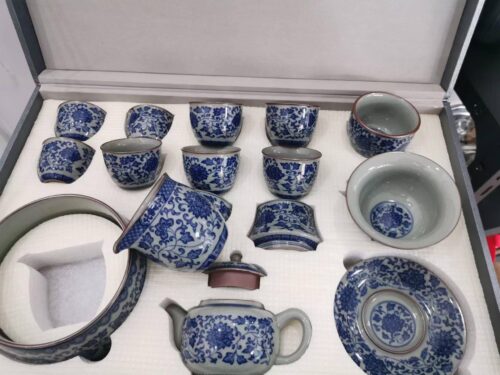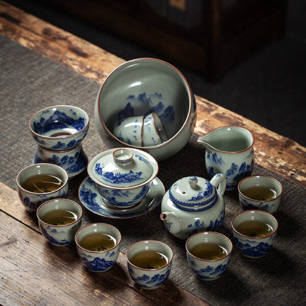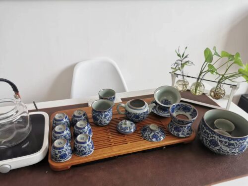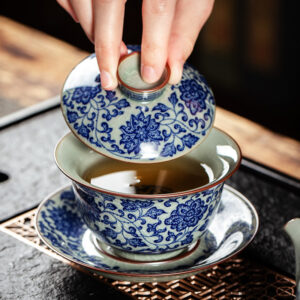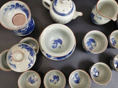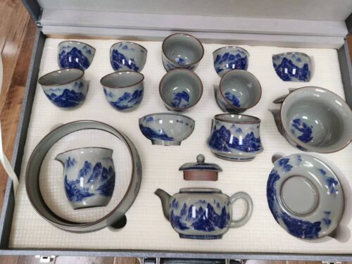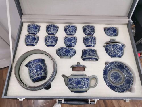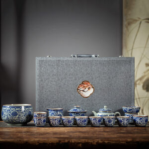 Get the complete vintage gongfu tea set in blue and white porcelain that is perfect for anyone looking to get into gongfu tea. The set includes a Gaiwan set, a teapot, a fair cup, a set of tea strainers, a washer, one master cup, and eight tasting cups. You can look more professional at a tea ceremony party by letting yourself use the master cup and letting your guests use the tasting cups.