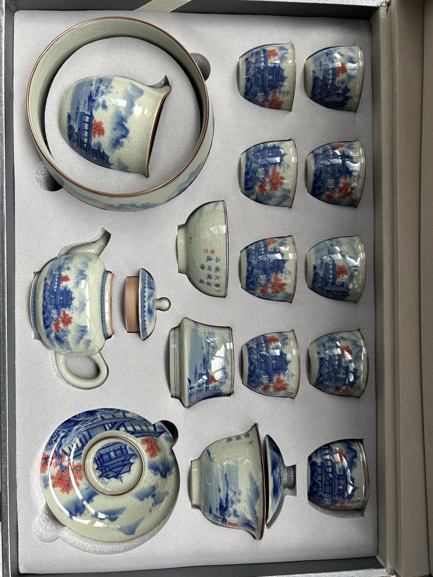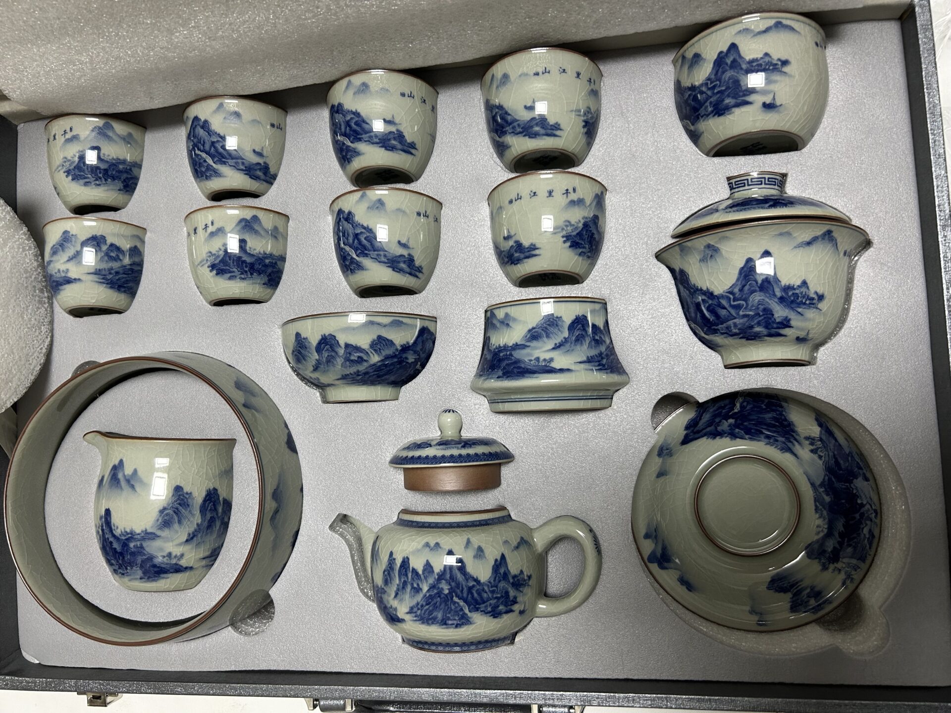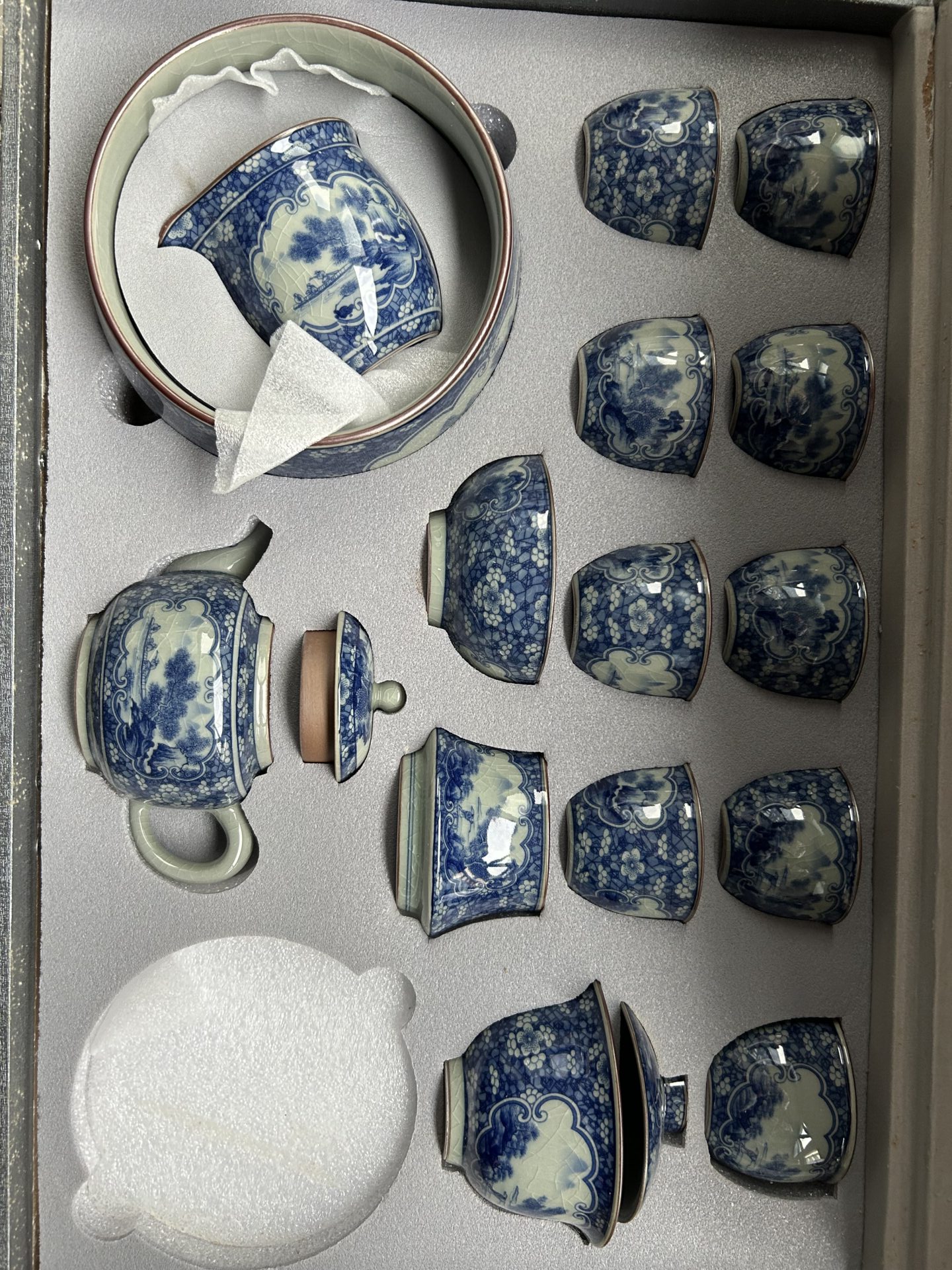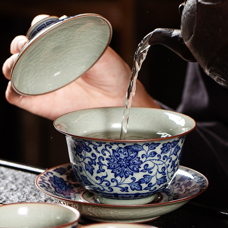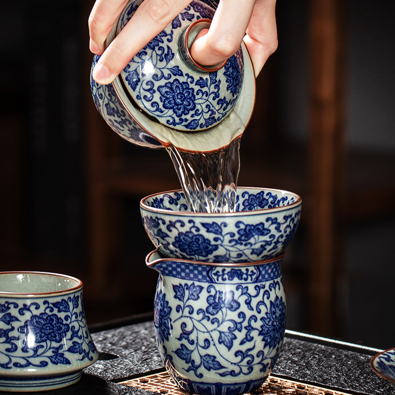 Get the complete vintage gongfu tea set in blue and white porcelain that is perfect for anyone looking to get into gongfu tea. The set includes a Gaiwan set, a teapot, a fair cup, a set of tea strainers, a washer, one master cup, and eight tasting cups. You can look more professional at a tea ceremony party by letting yourself use the master cup and letting your guests use the tasting cups.