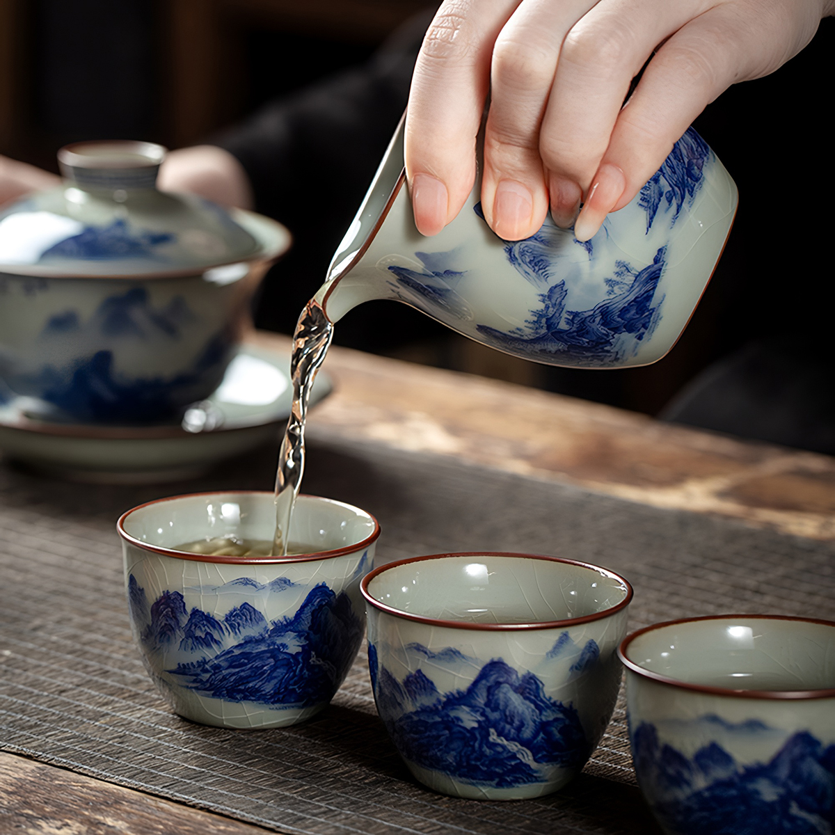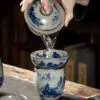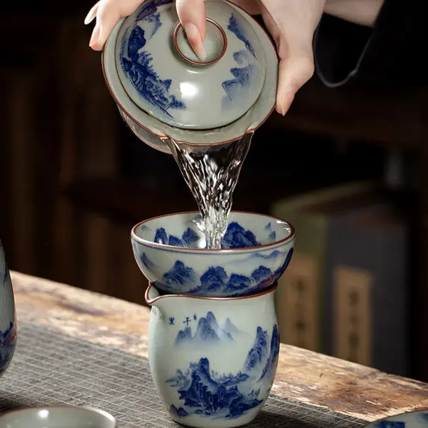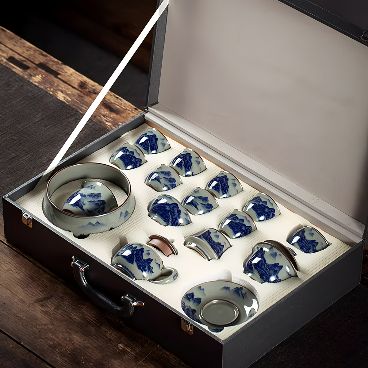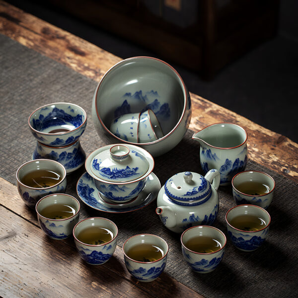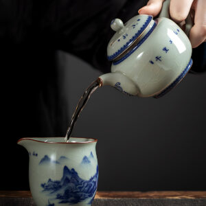 Get the complete vintage gongfu tea set in blue and white porcelain that is perfect for anyone looking to get into gongfu tea. The set includes a Gaiwan set, a teapot, a fair cup, a set of tea strainers, a washer, one master cup, and eight tasting cups. You can look more professional at a tea ceremony party by letting yourself use the master cup and letting your guests use the tasting cups.