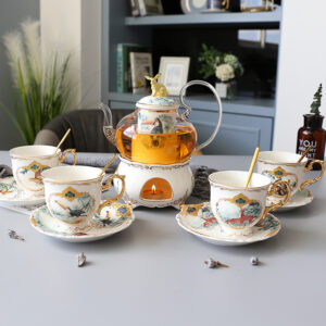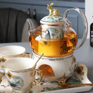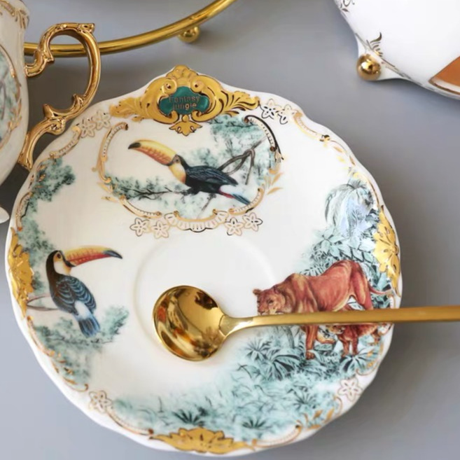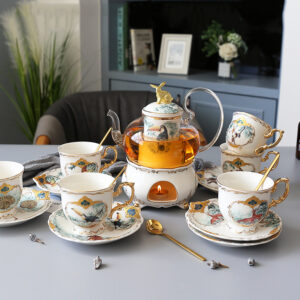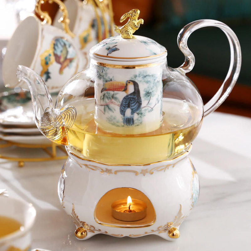 Our Jungle porcelain tea set is perfect for any tea lover who is looking for a beautiful and elegant way to enjoy their favorite blends. The set includes a teapot, a warmer, cups, and saucers, all made with the finest quality porcelain. The stunning jungle design is sure to impress, with delicate hand-painted gold accents on the cup handles. The teapot is made of glass, allowing you to admire the color of the tea while drinking. It has a warmer that can hold candles to warm the tea.