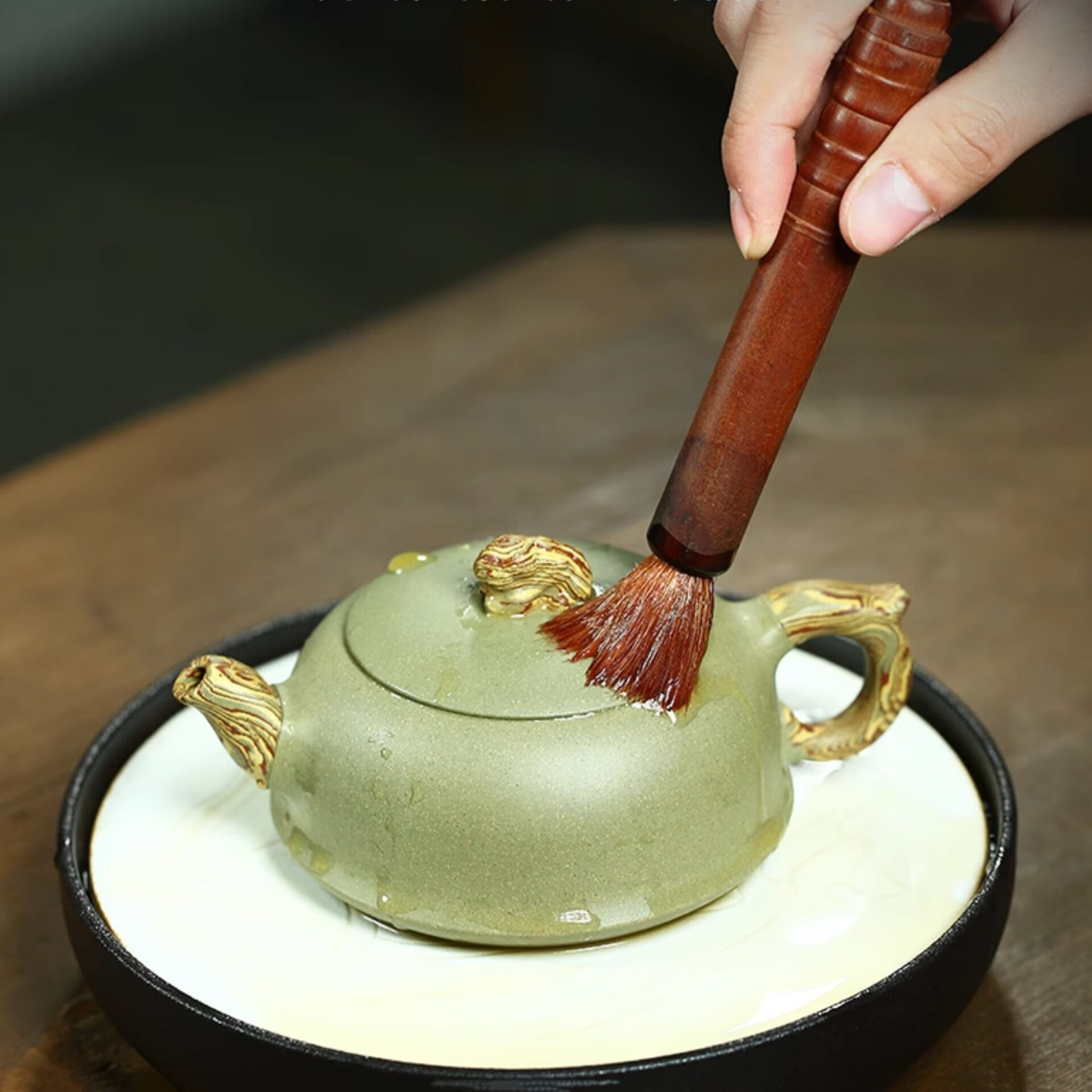 The teapot features a robust Zhuchu (pillar base) design, offering a strong, commanding silhouette. It feels solid and comfortable in hand, with a smooth and steady pour. The lid is crowned with a sculpted lion-shaped knob, adding a distinctive touch of traditional symbolism and beauty.