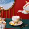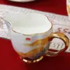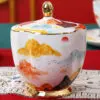 This complete 15-piece set includes a teapot, milk jug, sugar bowl, six cups, and six saucers, making it perfect for entertaining guests or enjoying a quiet afternoon tea. The mountain landscape pattern in vibrant orange and white hues is complemented by elegant gold accents on the handles and lid knobs, offering a sophisticated touch to your tea service. Ideal for use in formal settings or as a cherished gift, this tea set not only serves your finest brews but also acts as an enchanting centerpiece that captivates and converses.