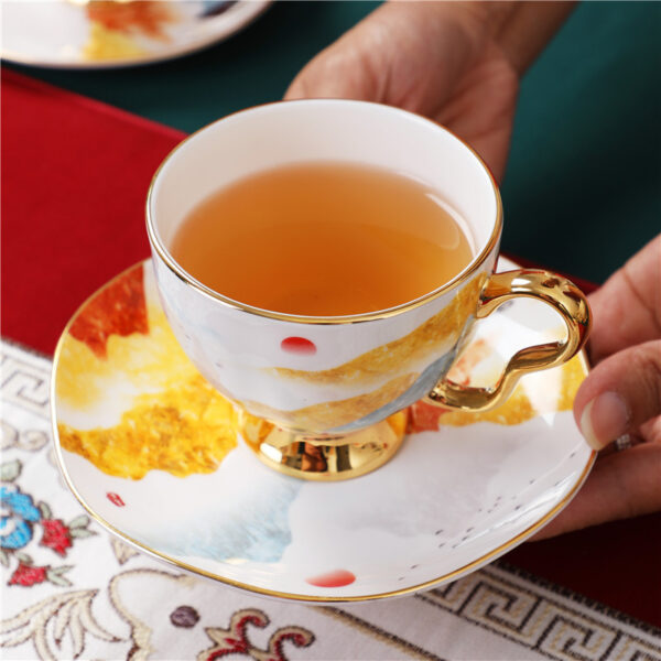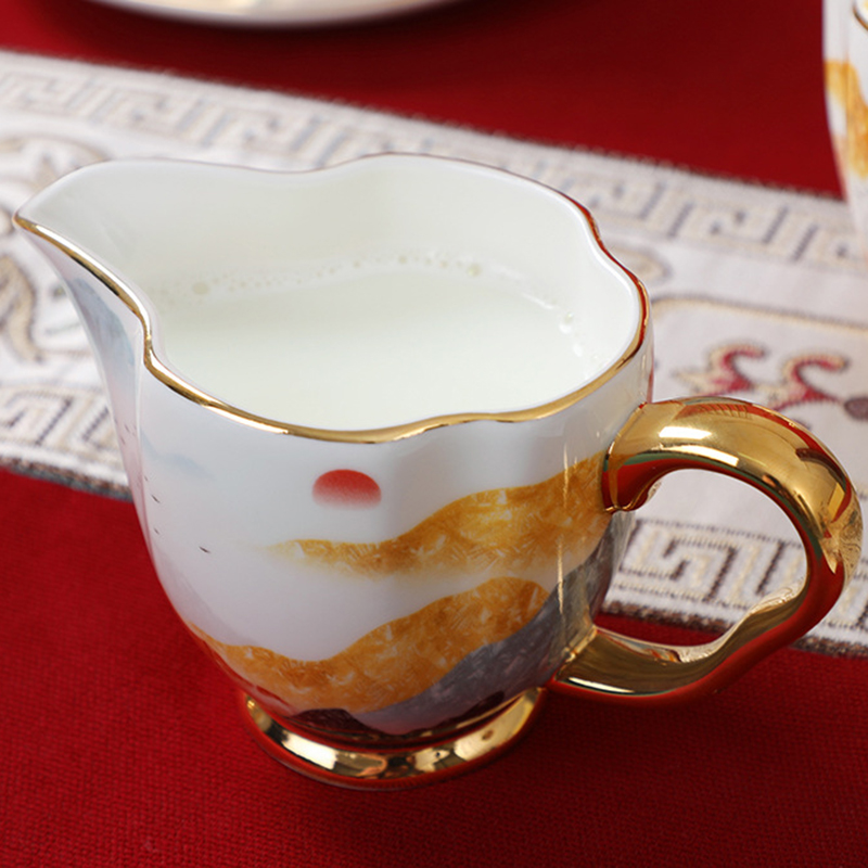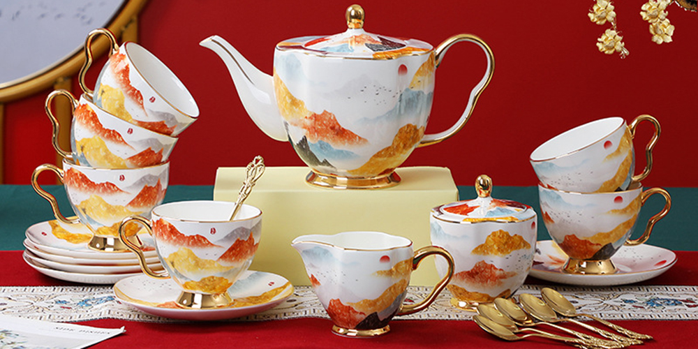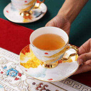 Step into a world where East meets West with our Mountain-range English Tea Set, crafted from the finest bone china. This luxurious set brings a unique fusion of traditional English tea culture and Chinese artistic aesthetics. The set’s design features an exquisite mountain range motif that symbolizes the majestic beauty of the East, presented on a backdrop that blends seamlessly with the Western tradition of tea drinking.