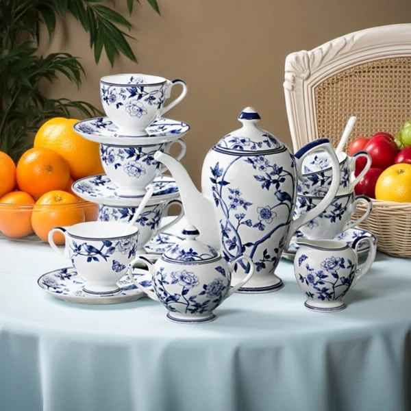 Indulge in the sophistication of our Peacock Afternoon Tea Set Bone China Teapot Set. Elevate your afternoon tea experience with this exquisite English-style bone china coffee and tea set. The intricate phoenix and floral designs in classic blue and white create a captivating aesthetic, adding a touch of beauty and opulence to your dining table. This set is designed to be the perfect addition to any gathering, captivating your guests with its stunning design and complete tea service. With a coffee pot, milk jug, sugar bowl, 6 cups, and 6 saucers, it is ideal for serving a complete afternoon tea. Additionally, the original design includes 6 porcelain teaspoons, and to enhance its durability, we’ve added 6 exquisite metal spoons. Crafted from premium bone china, this set is not only visually stunning but also durable, chip-resistant, and easy to clean. Make a statement and transform your afternoon tea into a luxurious affair with our Peacock Blue White Coffee and Tea Set. Order now and delight in the timeless elegance of this exquisite porcelain set.