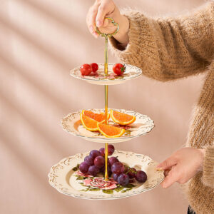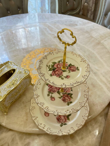 This Vintage Rose Cake Stand combines timeless elegance with practical design, making it a perfect addition to any table setting. Crafted from premium porcelain, the three-tiered stand features a delicate vintage rose pattern, accentuated by elegant edges that exude sophistication. Its sturdy golden metal pole not only ensures durability but also adds a touch of luxury. The spacious three-layer design provides ample room to beautifully display cakes, fruits, or pastries, making it ideal for afternoon tea, weddings, birthday parties, and other gatherings. The convenient top handle allows for easy portability, making this stand as functional as it is beautiful. Whether hosting an elegant event or decorating your home, this cake stand is sure to impress.