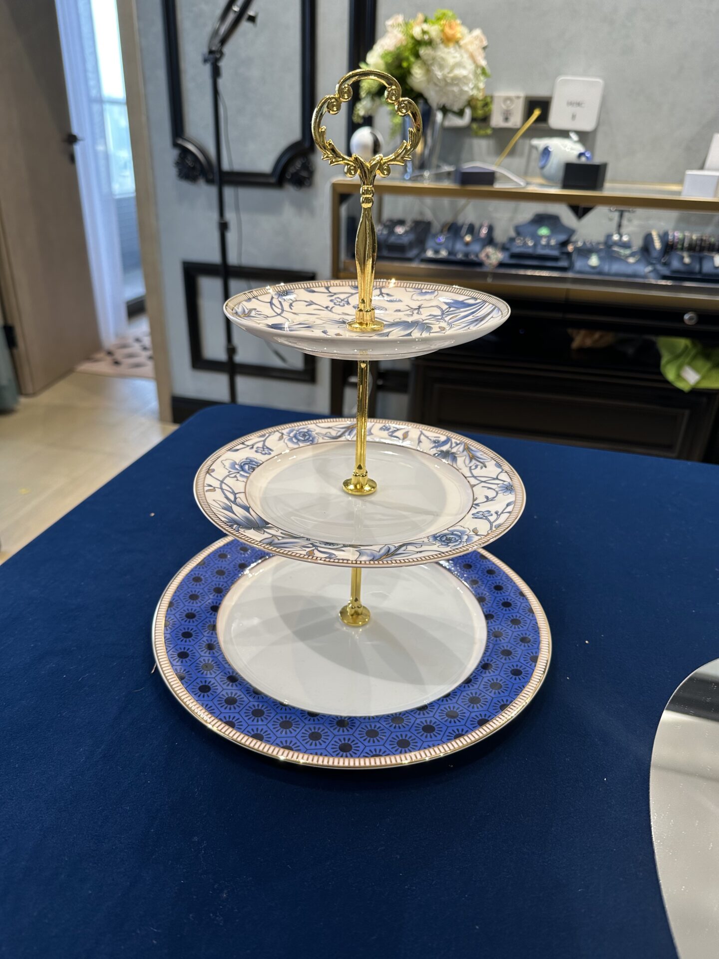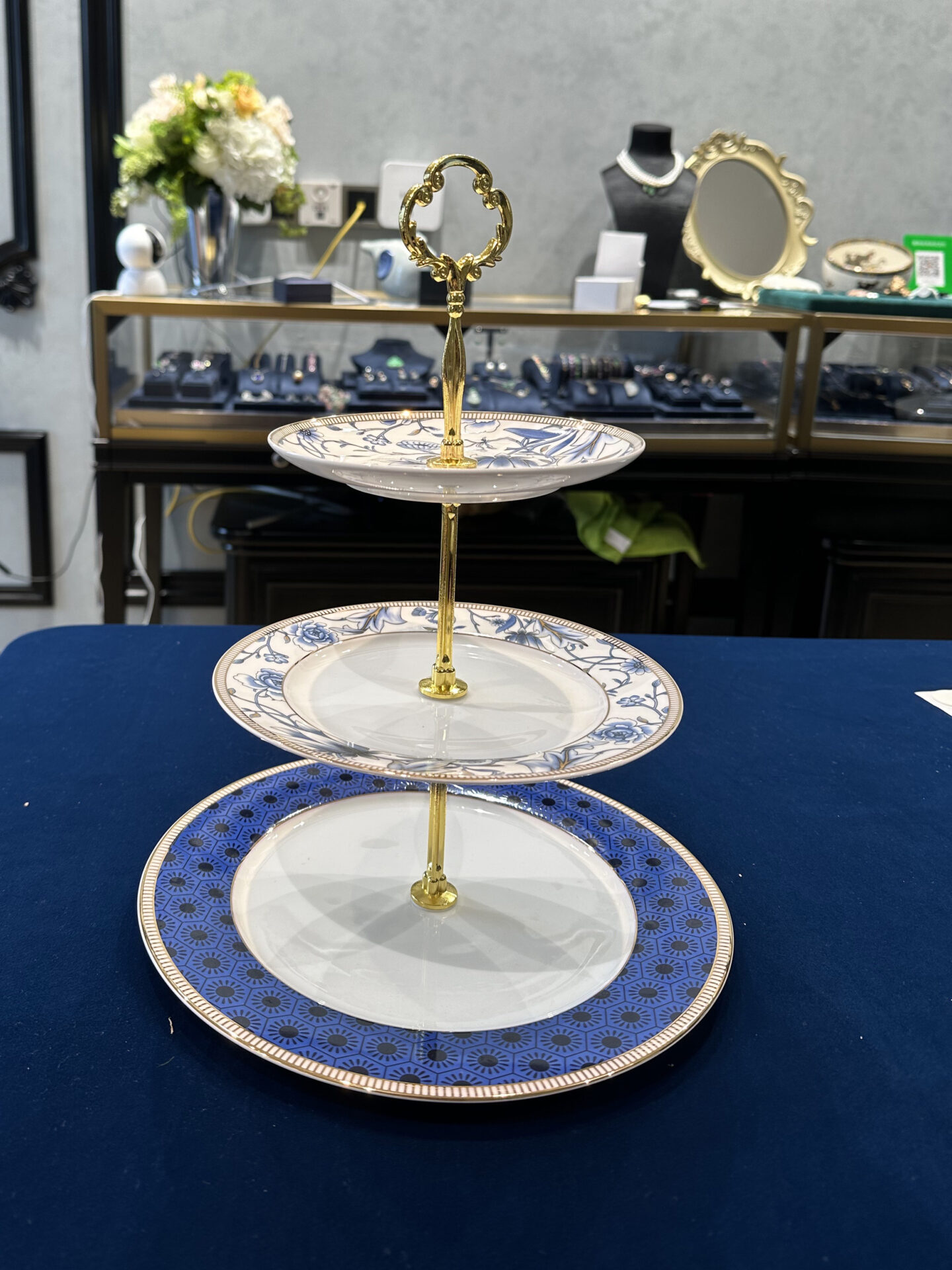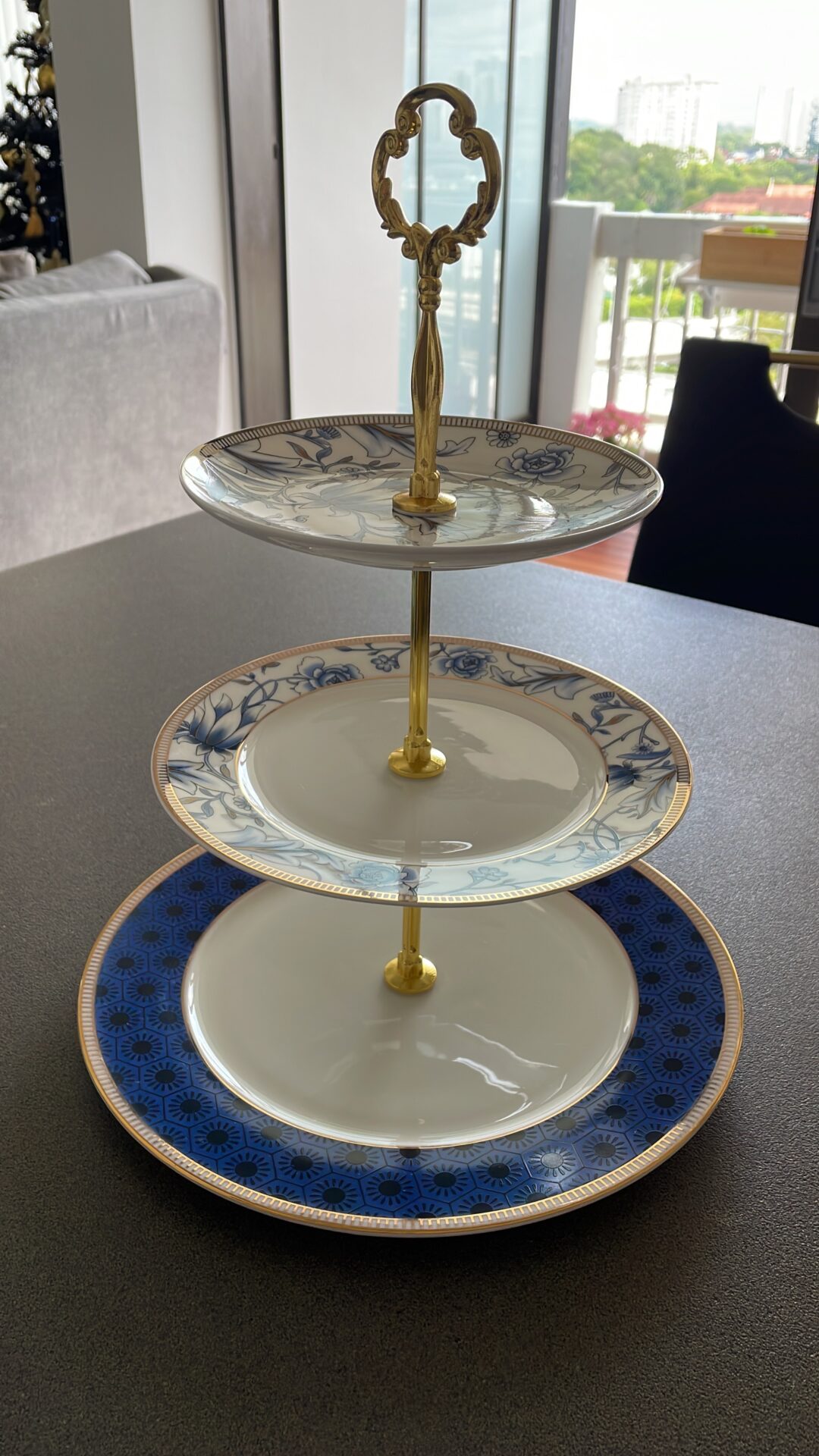I really like this three tiers. Solid, sturdy, clean crisp blue and white color, classic and easy to put together.