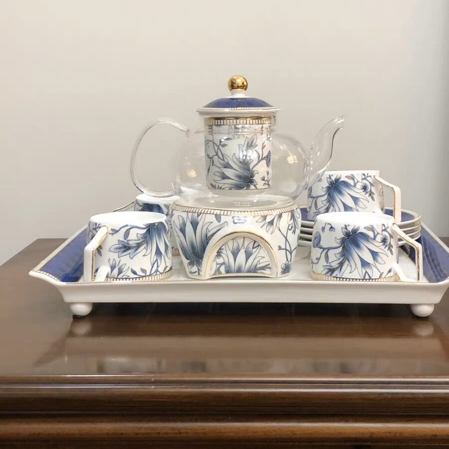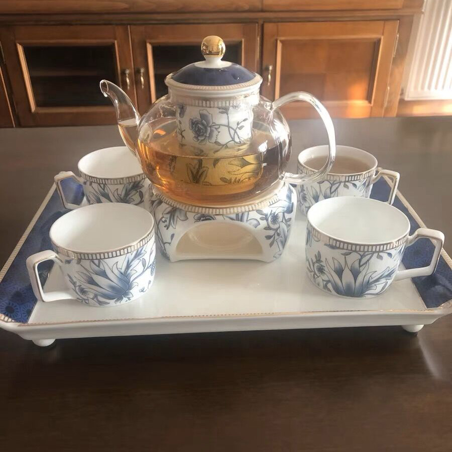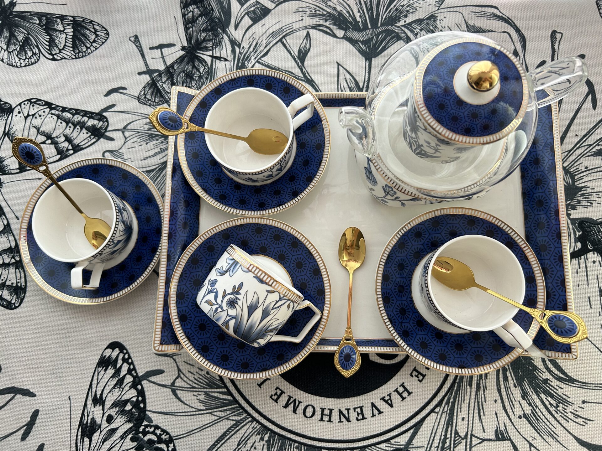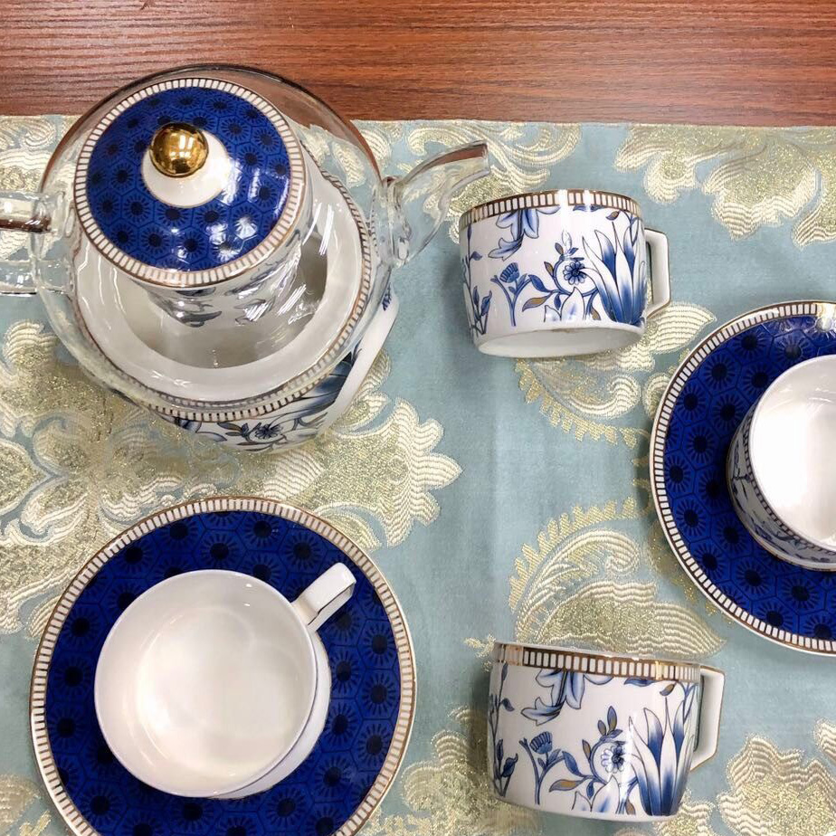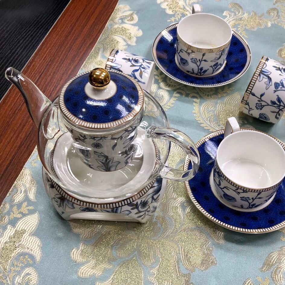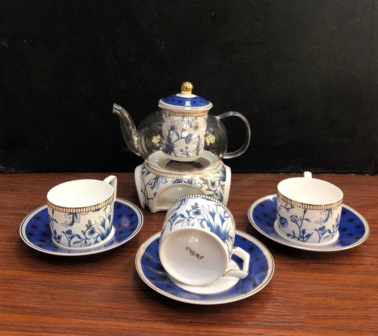 Elevate your tea-drinking moments with our exquisite Yucca English Bone China Tea Set. Immerse yourself in the classic charm of blue and white hues adorned with a beautiful Yucca flower pattern, creating an atmosphere of timeless elegance. This complete tea set includes a glass teapot with a convenient warmer and four cups, and you can choose the option with a luxurious tea tray. Made with high-quality bone china, this set ensures durability and longevity, making it a sophisticated choice for your afternoon tea gatherings. Order now and let the Yucca English Bone China Tea Set become the centerpiece of your refined tea-drinking experience.